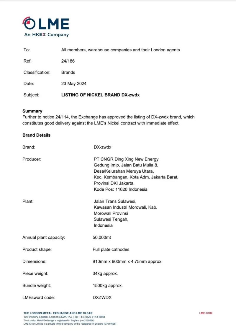 2024年5月23日,全球最大的有色金屬交易中心-倫敦金屬交易所(簡稱“LME”)發布公告,印尼中偉鼎興新能源有限公司生產的“DX-zwdx”牌電解鎳獲得LME的認證注冊,正式成為LME鎳交割品牌,標志著印尼生產的純鎳獲得“全球通行證”,這是東南亞首個LME鎳交割品牌,增強了印尼鎳產業在全球的影響力,對整個東南亞、印尼的鎳產業發展具有重要意義。